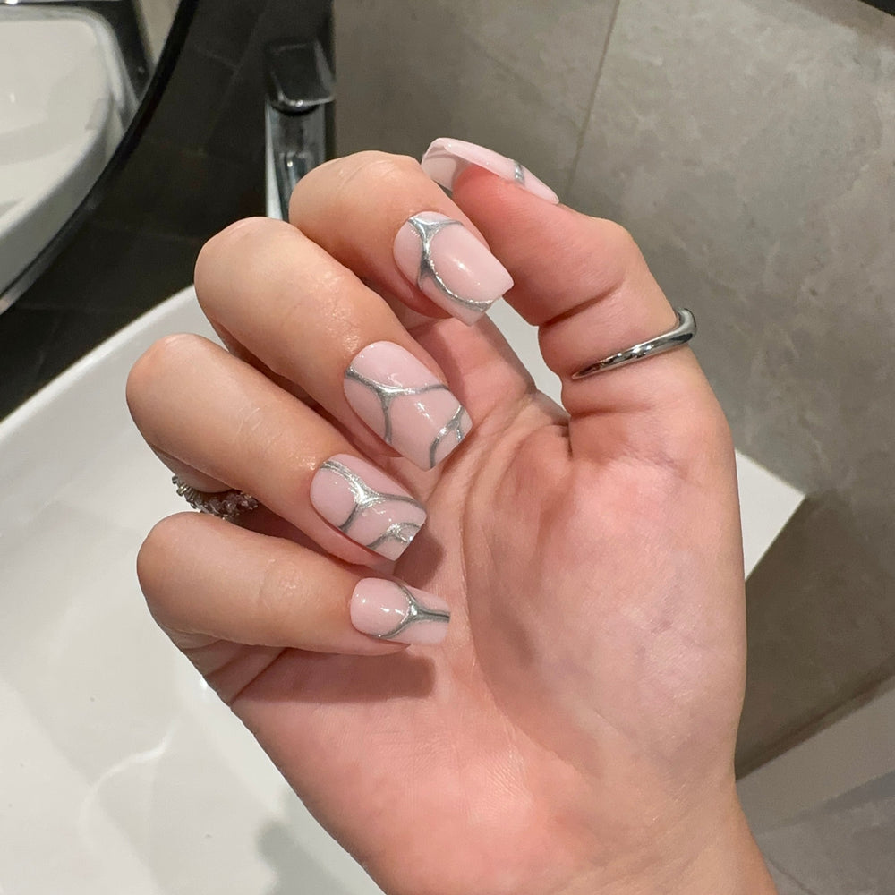 Press-On Nehty Edgy Babe jsou trendy spojením jemného nude podkladu s chromovými metalickými detaily. Takzvaný liquid chrome je 3D, takže mírně vystupuje vzhůru a dotváří tak celkový look a vytváří zajímavý trend efekt. Díky technice press-on si nehty můžeš nalepit, ať už na jednorázovou událost nebo i na celé dva týdny. Stačí si vybrat délku a tvar!