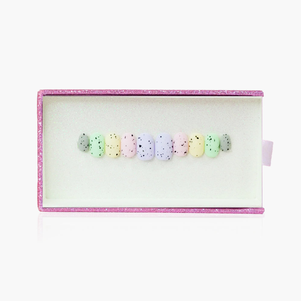 Nalepovací nehty Egg-stravaganza jsou skvělou velikonoční volbou! Jednoduché pastelové barvy jsou obohacené o vzor připomínající velikonoční kraslice. Tento design ti dokážeme vyrobit v lesklém i matném provedení.