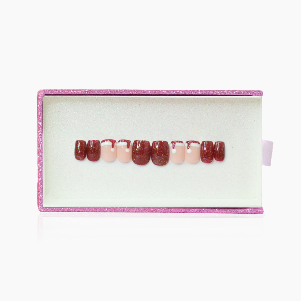 Press-on nehty Santa Baby jsou krásné vánoční nehty se třpytivým top coatem. Francouzská špička v provedení mikulášské čepice doplňuje celý look. Skvělé pro vánoční období či párty.