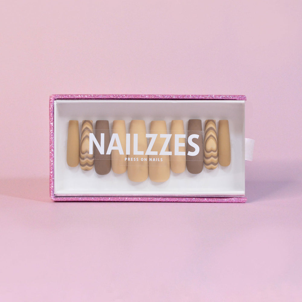 Press-on nehty Sweetheart v hnědém provedení, u kterých nemusíš být zamilovaná na to aby ses zamilovala. Trendy srdíčkový vzor okouzlí tebe i všechny ve tvém okolí. Díky revoluční technice press-on si nehty můžeš užít, ať už na jednorázovou událost nebo i během celých dvou týdnů. Stačí si vybrat délku!
